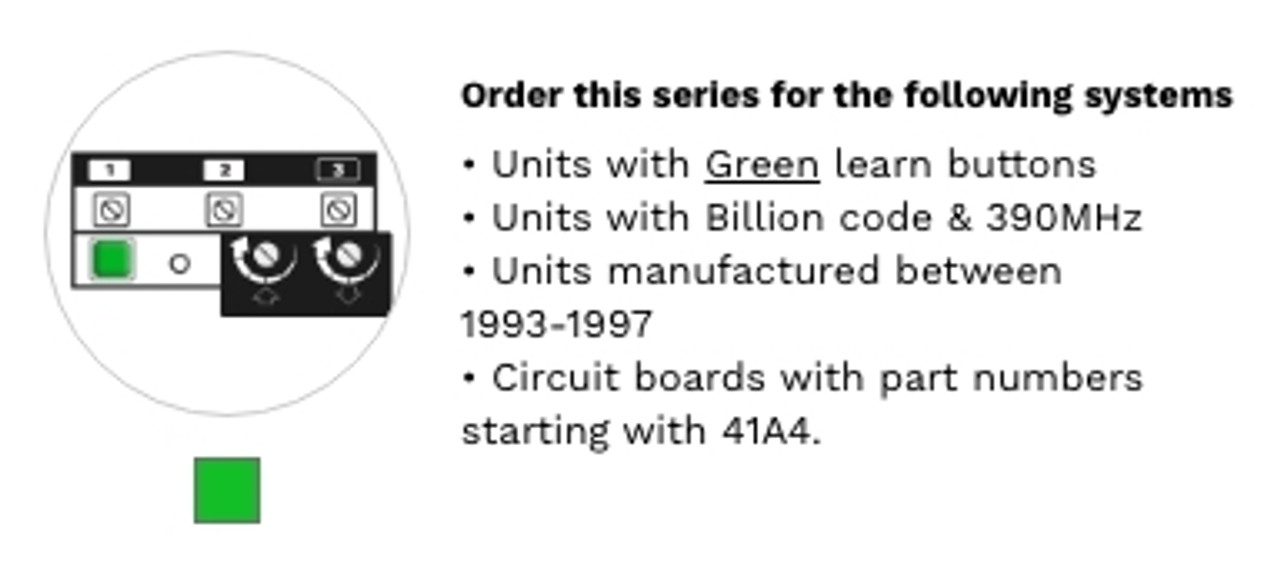 Order this series for the following systems, Units with Green learn buttons and Units with Billion code & 390MHz. Also Units manufactured between 1993-1997 as well as Circuit boards with part numbers starting with 41A4...
